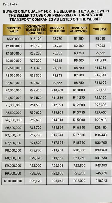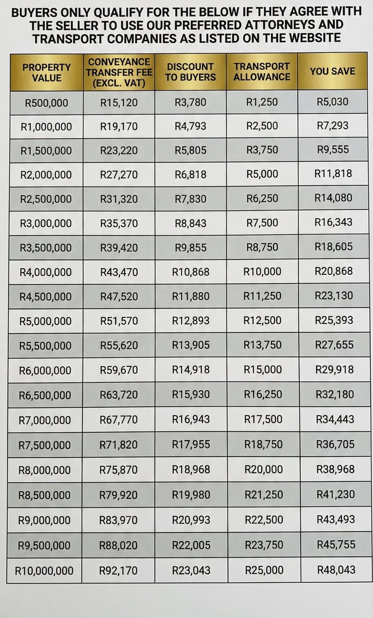 NOTE: - 1. Conveyancing Attorney Fees are calculated by the Law Society of South Africa, the above are the latest fees. The full transfer costs are not included the above. Your benefit as a buyer is calculated as 25% discount on the CAF and is shown as such on the conveyancer's invoice.